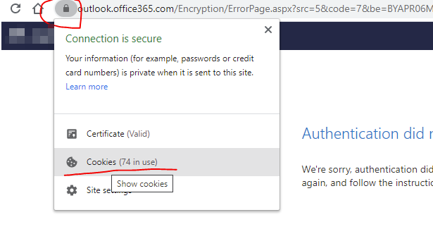 In this case, click to open the message like normal, and when you get the screen that says authentication did not complete, click on the lock in the address bar and choose cookies like below: